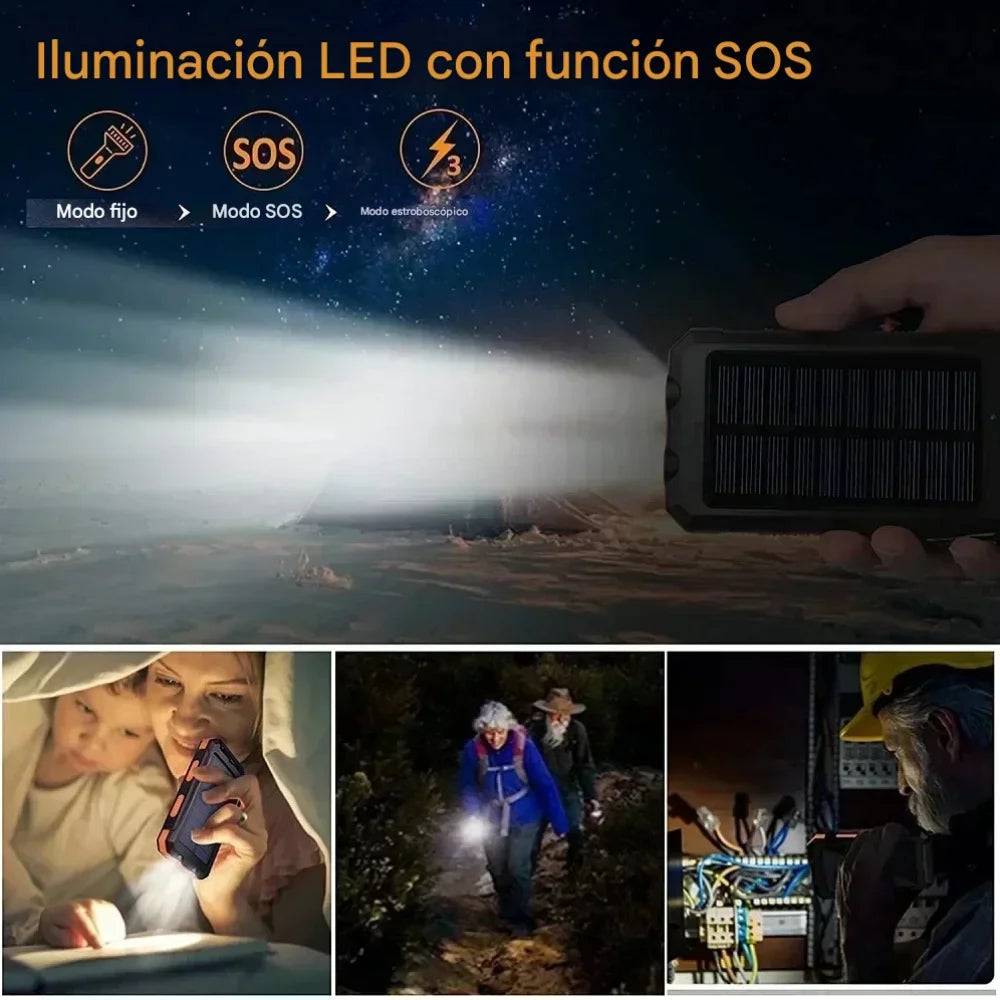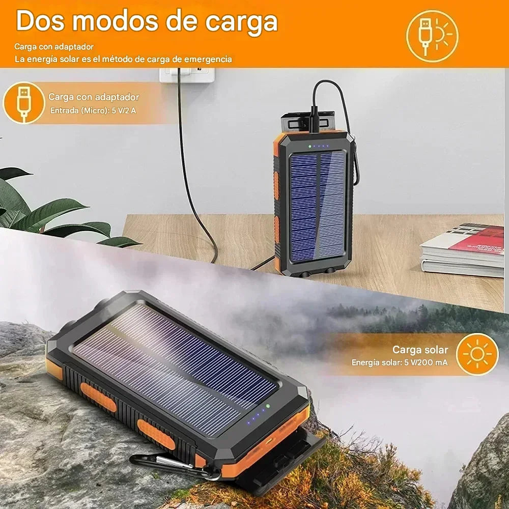 El panel solar incorporado permite recargar el power bank incluso lejos de enchufes, brindando total independencia en senderos, campamentos, rutas y situaciones de emergencia.